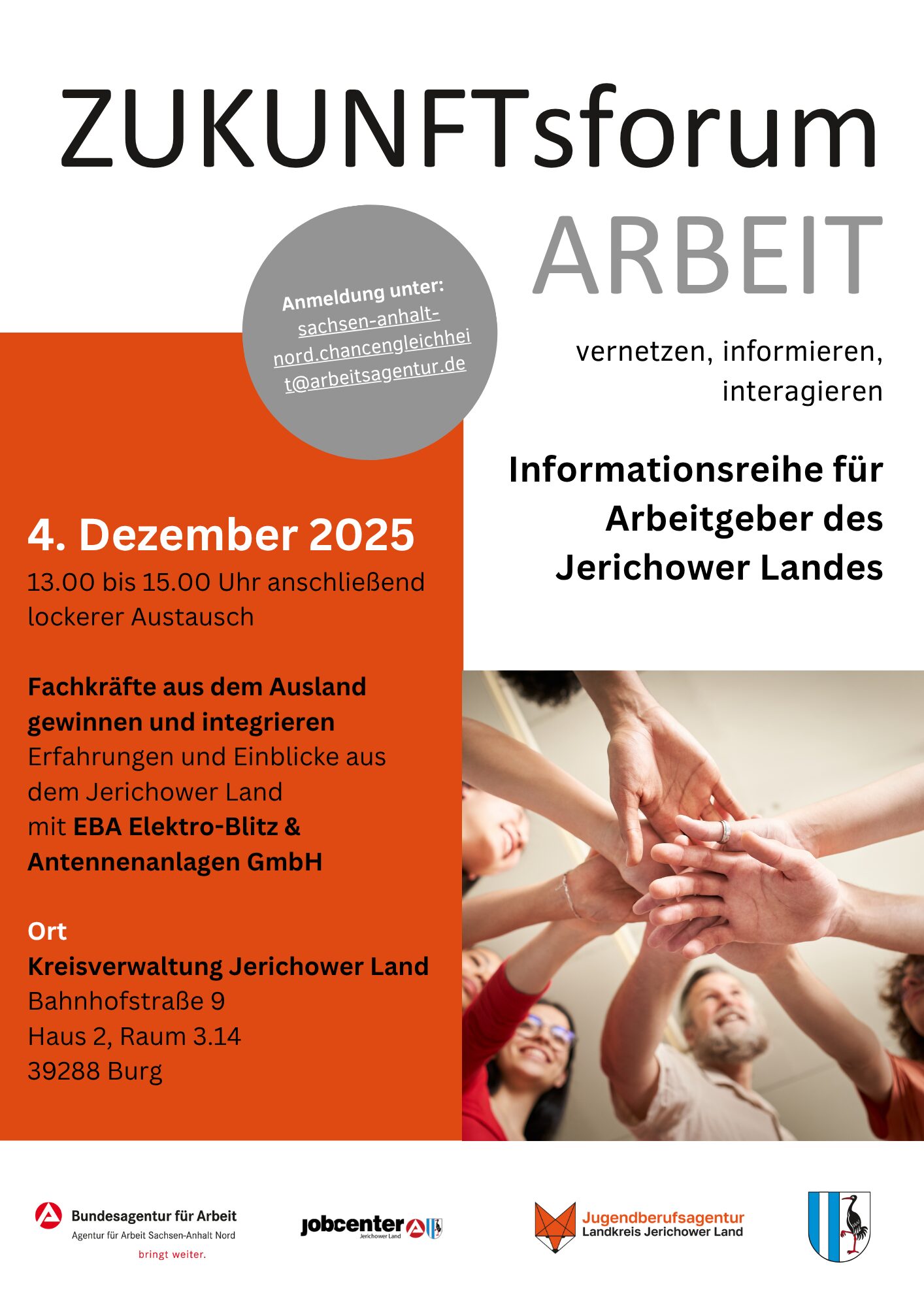 Landkreis Jerichower Land4. Dez 25 - Thema „Fachkräfte aus dem Ausland gewinnen und integrieren“ Erfahrungen und Einblicke aus dem Jerichower Land mit EBA Elektro-Blitz & Antennenanlagen GmbH und dem Arbeitgeberservice der Agentur…